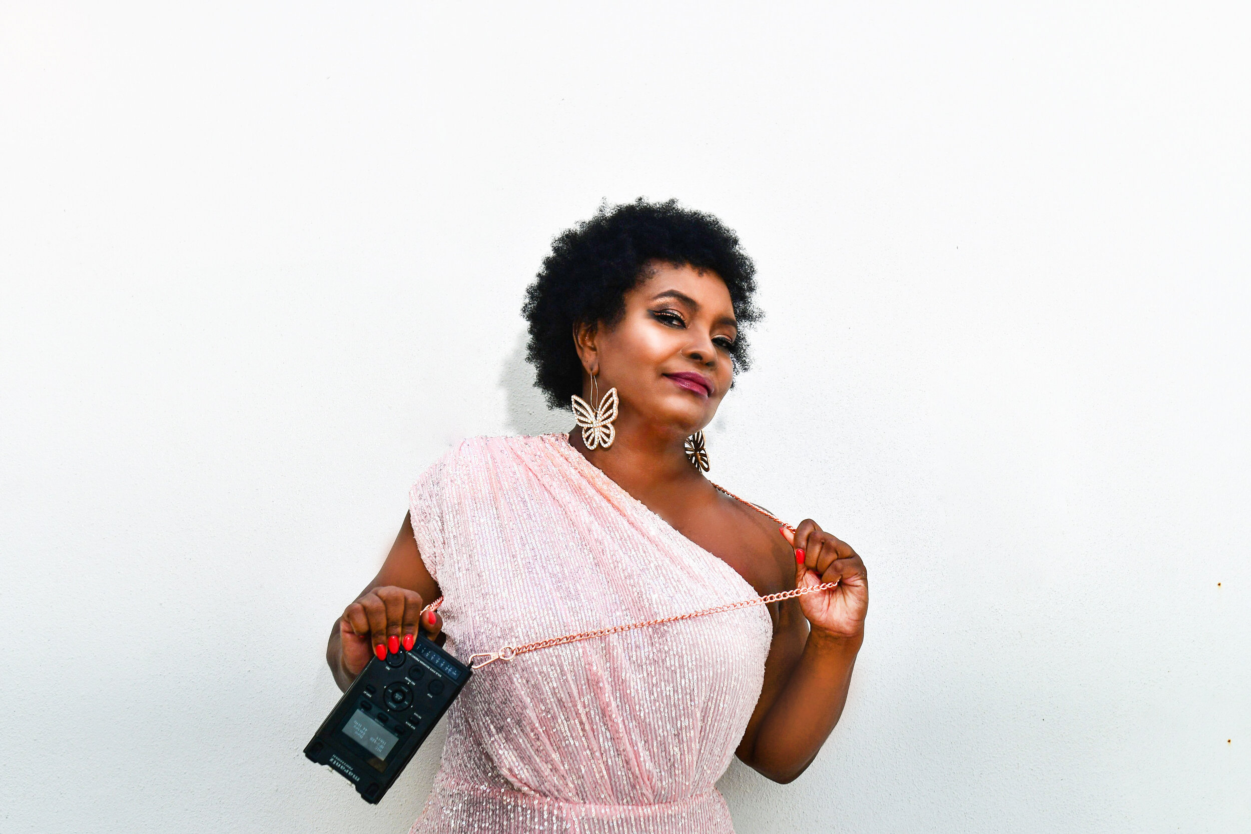 LaTonya is wearing a Jay Godfrey pink Georgia Sequin One Shoulder Cap Sleeve Jumpsuit. Photographer Jai Simone, Makeup Tanya Blake, Hair Marcus Eddington, Nails Kieu of Blush Nail Salon